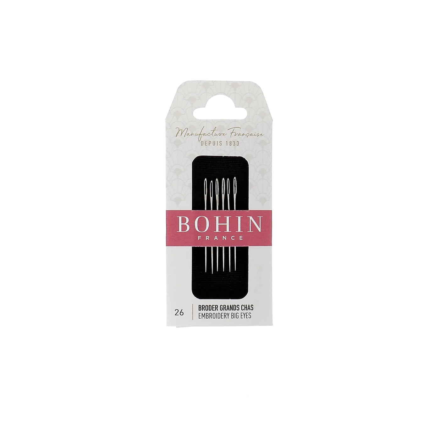 Big Eye Embroidery Needles size 26. Formally known as "Chenille Needles", Bohin France's Big Eye Embroidery needles are exactly the same thing, just under a different name. Similar in size and shape to a tapestry needle, but with a sharp point. Slightly shorter in length (only 1¼" long) than an embroidery needle, with an eye longer and wider. Used for embroidery and crewel work. Made of premium grade nickel plated steel. 6 needles per card